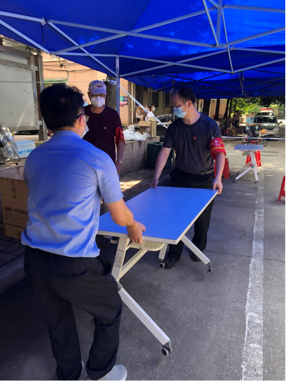 “星耀总承包”党员志愿服务队抵达核酸检测支援现场后,迅速投入工作中,各司其职,协助街道搭建核酸采样点工作棚、搭建检测点工作台、搬运核酸检测工具、悬挂核酸检测点横幅等,全力做好核酸检测前期准备工作。