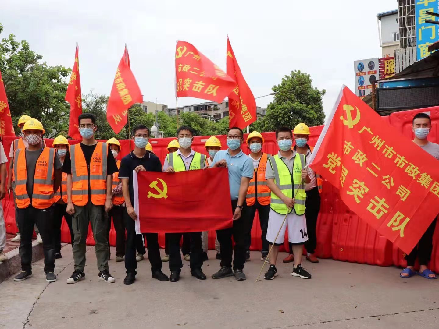 市设计院和产研院组织设计团队连夜统计围蔽工作量,彻夜不眠完成围蔽方案设计;市政集团共派出19名管理人员、58名工人参与石围塘街道围蔽施工,通宵完成围蔽1100米;总承包集团派出64人参与芳村街道围蔽施工,完成围蔽800米;工程事业部共派出30名管理人员和41名建筑工人参与花地街辖区内9个社区的围蔽施工,采取划片分区的施工模式,从早上7:30冒雨施工,持续作战十余小时。四建公司到晚上12时全部完成995米围蔽任务后28人转战冲口街,至今晨6时全部完成1000米围蔽任务。盾建公司通宵施工,负责荔湾区东沙街道东塱联社、中南街道花卉大街两个区域共计5100米的围蔽任务;第三批支援队伍16人晚上10点40分到达指定地点江南中街,后续20人正在向荔湾集结。