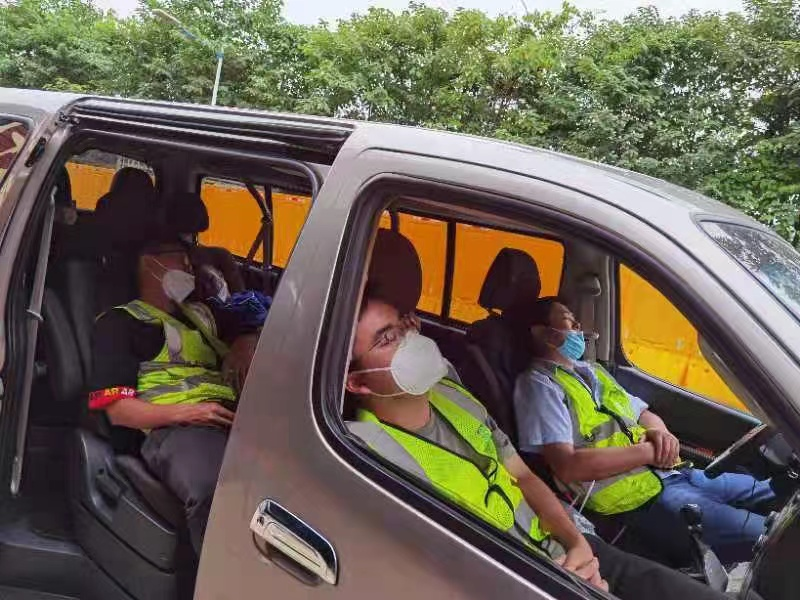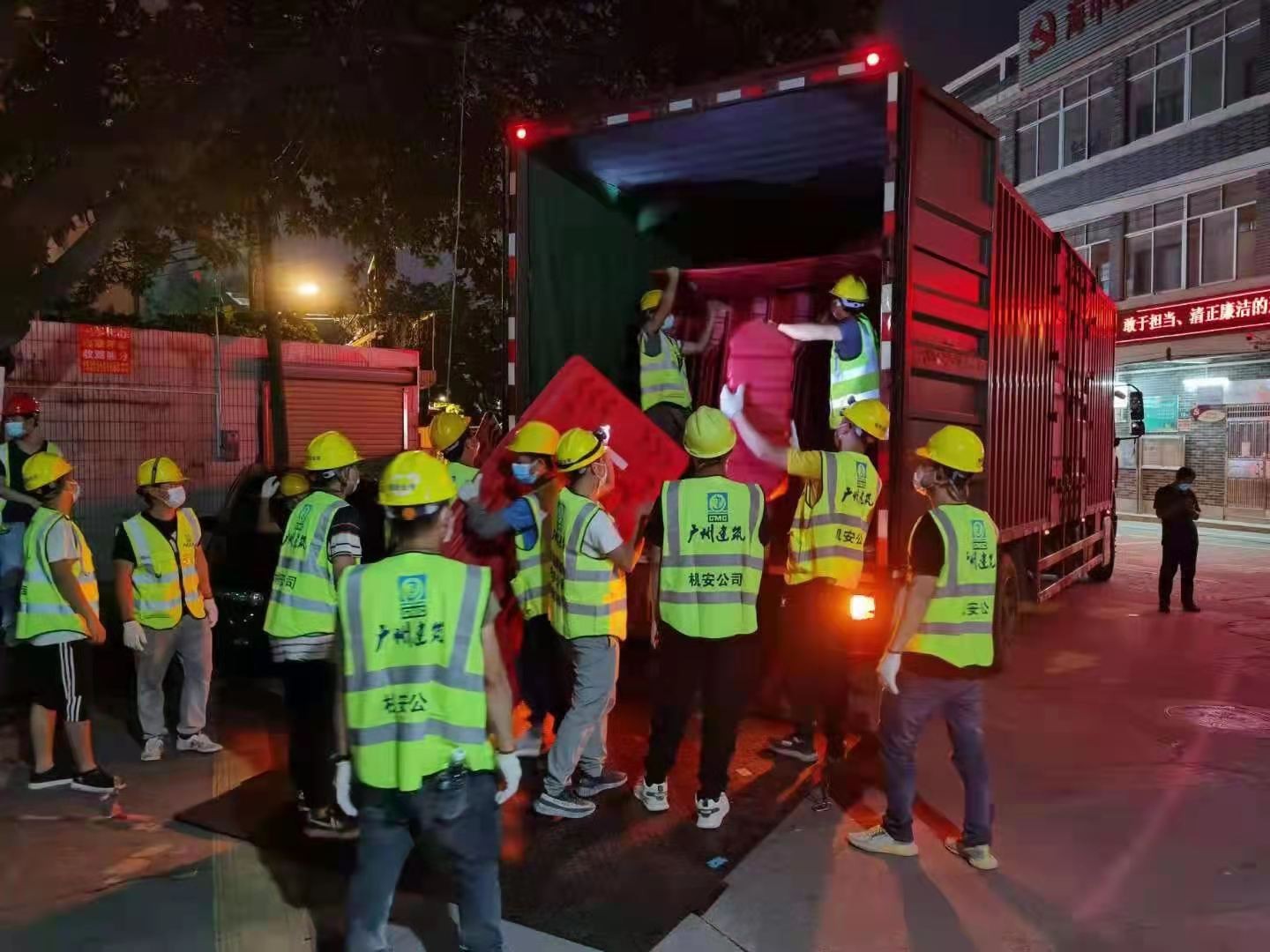 一建集团派出19人参与荔湾区海龙街围蔽施工,完成780米;二建公司派出46人参与海龙街围蔽施工,完成围蔽约1400米;三建公司派出35人参与荔湾区海龙街道和中南街道围蔽任务,完成3000米;恒盛公司负责的中南街道围蔽任务已全部完成、芳村大道围蔽任务已基本完成,清晨4点左右全部完成荔湾区冲口街3000米的围蔽任务;装饰集团派出28人参与东沙街道围蔽施工,完成隔离带约300米;机施集团负责的海中村围蔽工作已于今年8点完工;机安公司负责的东沙街围蔽任务已于下午5点全部完成,全员撤离并在酒店进行隔离。为了加紧赶工,不少员工主动放弃休息时间,通宵奋战,累了困了,席地而卧,力保项目建设顺利完成。