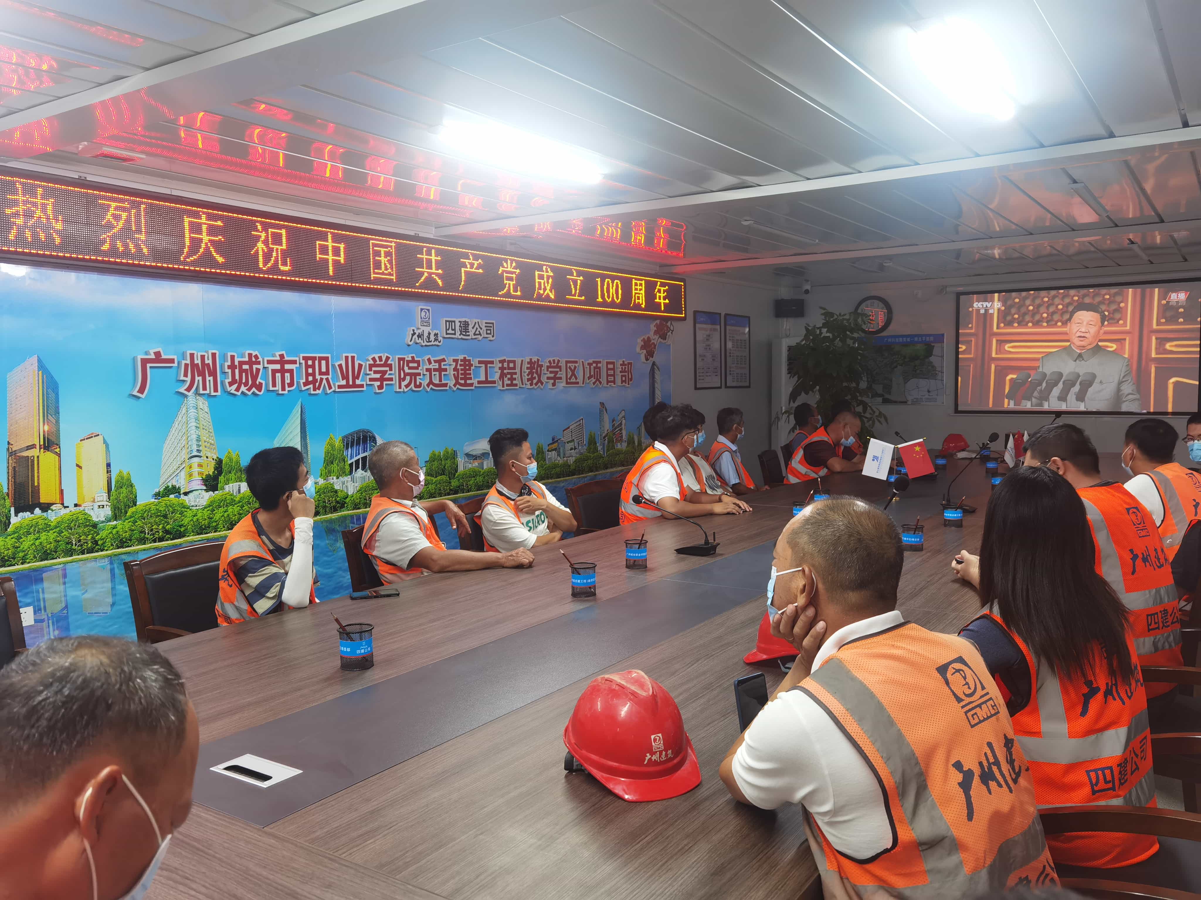 ▲四建公司城市职业学院工程收看大会直播