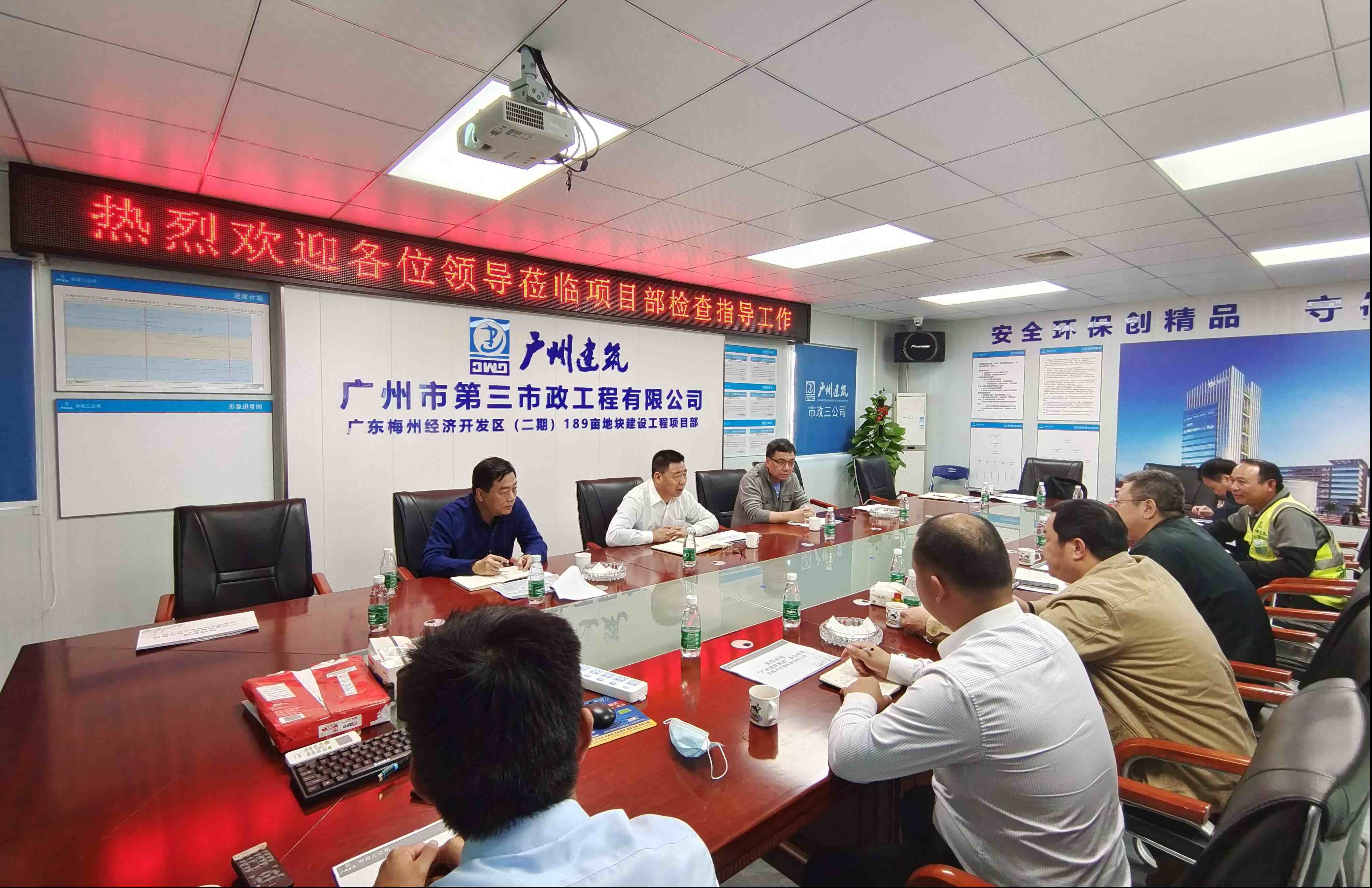 梁湖清同志一行首先检查了工程施工安全、质量及进度等情况,对项目文明施工、办公区生活区标准化建设提出了表扬。在随后的工作会上,梁湖清同志听取了项目进展情况汇报,对项目部的工作给予肯定,并要求市政集团三公司积极开拓梅州市场,把世界五百强企业文化和口碑形象在梅州发扬光大。同时,梁湖清同志强调,一要强化危大工程作业等重大风险源的安全管控。二要持续保持现场文明施工,并做好世界五百强的标识标语布置工作。三要毫不松懈抓好项目疫情防控常态化工作。四要提高项目履约管理能力。