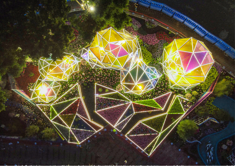 简介:作品以“天地人合一”为核心思想,通过使用镜面、镭射灯、声音互动装置等材料,融入水雾、花海、光与影等传统造景元素,组成独特的花园空间,映射出花都区独特且包容开放的城市生态。