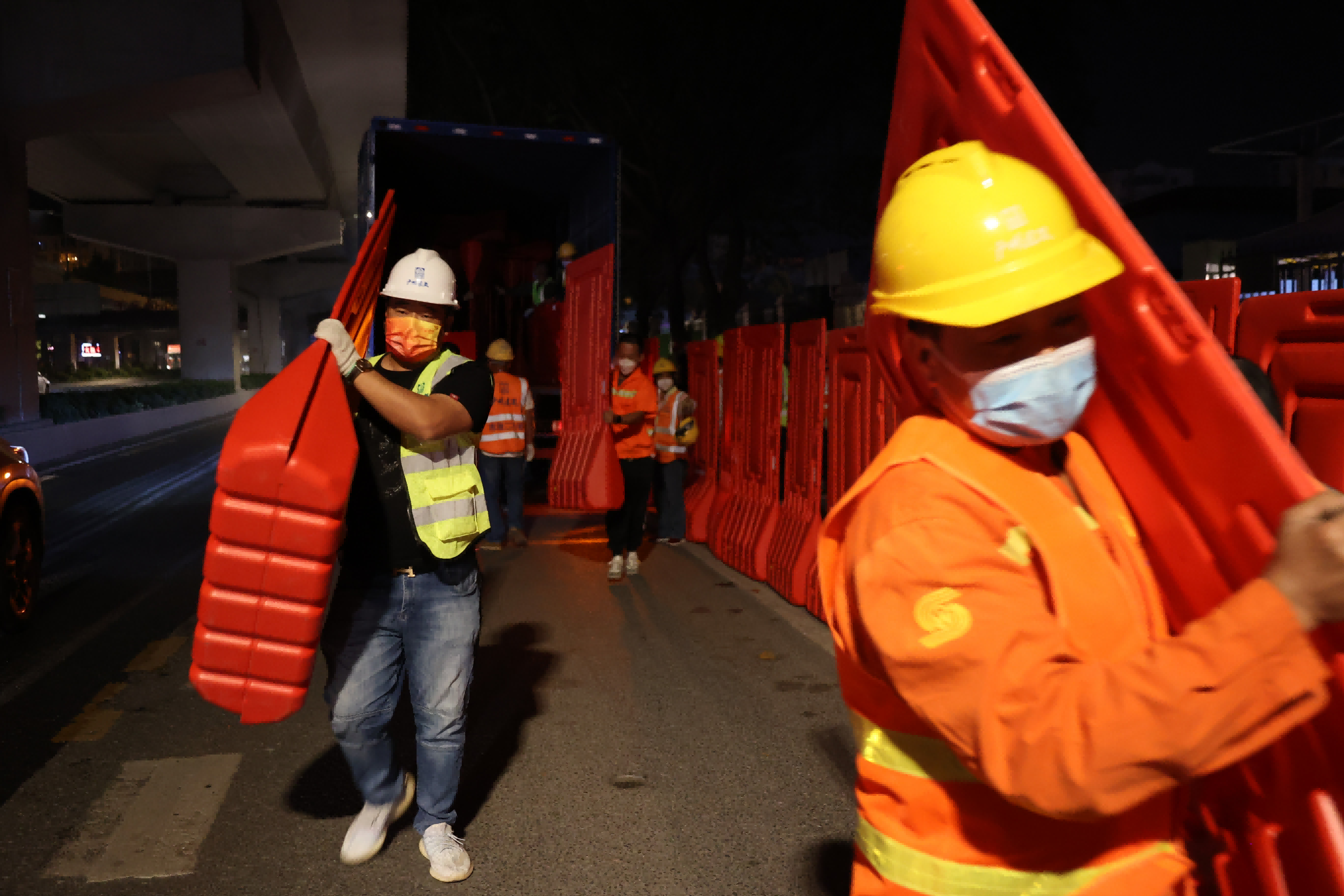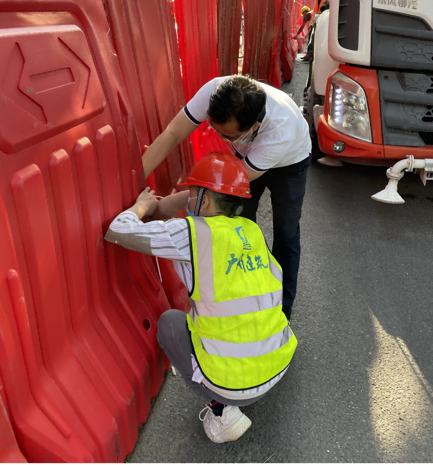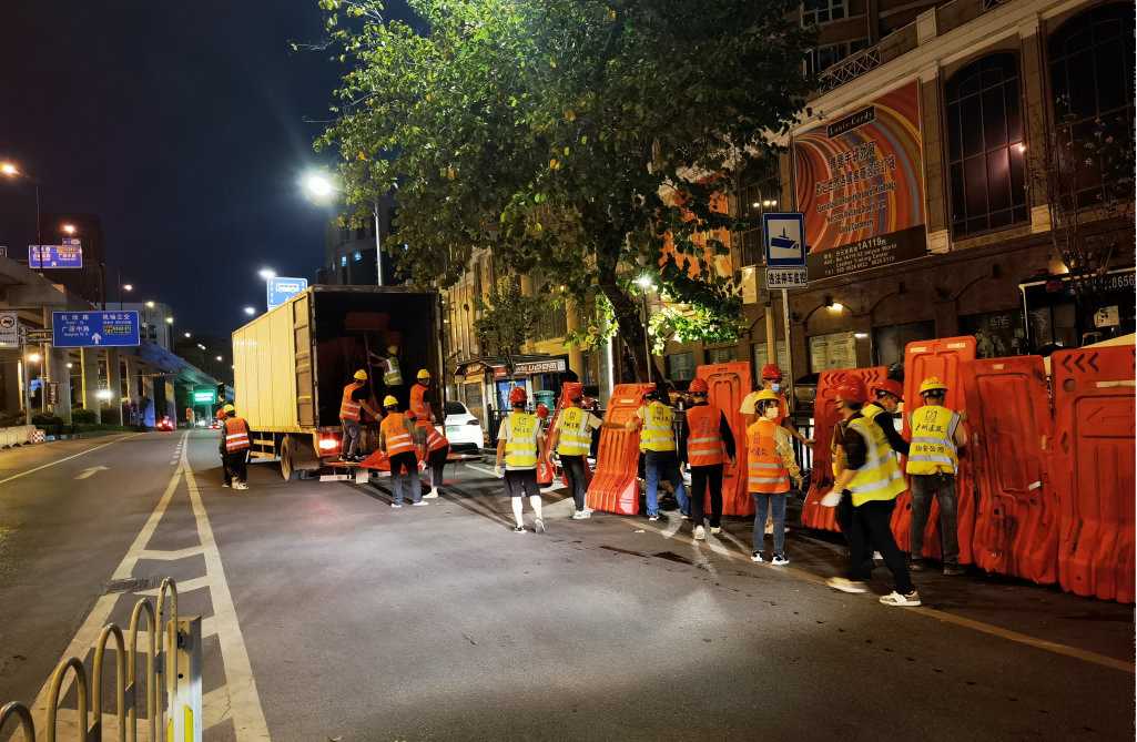 四建公司副总经理梁世雄带领10名管理人员和25名工人,在一小时内完成围蔽材料及工具采购运输工作,并克服卸货地点分散、街道狭窄需要人工搬运水马、居民不理解进行阻挠破坏等困难,完成沙涌北街1.5公里施工任务。恒盛公司派出由44名管理人员和306名工人组成的应急先锋队开展施工。面对时间紧急物资调动难度大、施工地区道路狭窄材料运输不便等困难,公司党委书记、董事长杨超宇及时协调部署,副董事长、总经理曾广庆和副总经理曾佳靠前指挥,调动各地可支配水马共计5046个,高效完成对云城路段、广园西路口、景云居、金信路向云城东路等区域共计6.3公里施工任务。