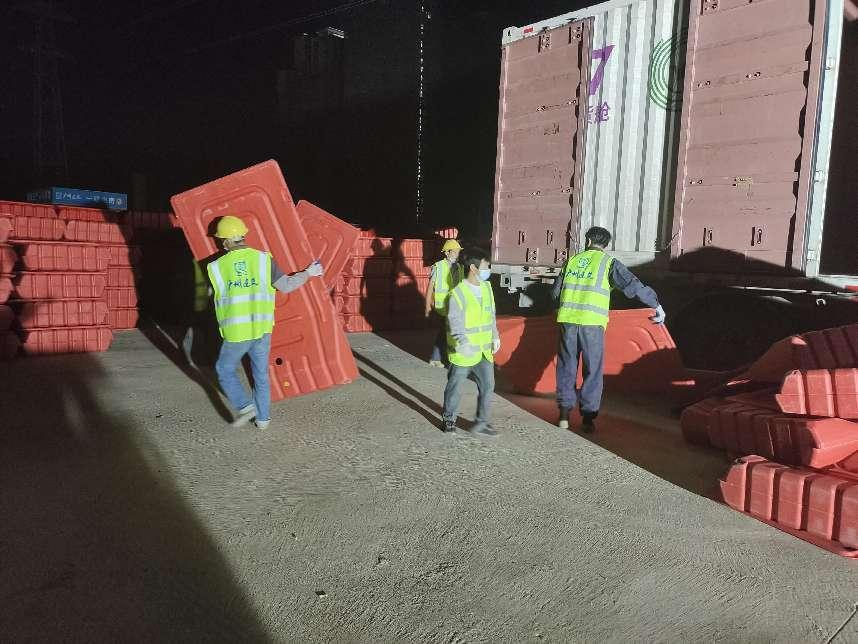 为确保物资供应“快、顺、稳”,工程事业部调度70多名作业人员、50台9.6米货运车,全体人员克服通宵作业的疲倦,先后分47车次从沙亭岗、金融城、机场三期等项目调配10000只水马至指定堆场及花都区4个防疫点,有序组织装、卸水马。经过十几个小时的通宵奋战,顺利完成水马供应任务,为防疫应急工程建设提供有力保障。
