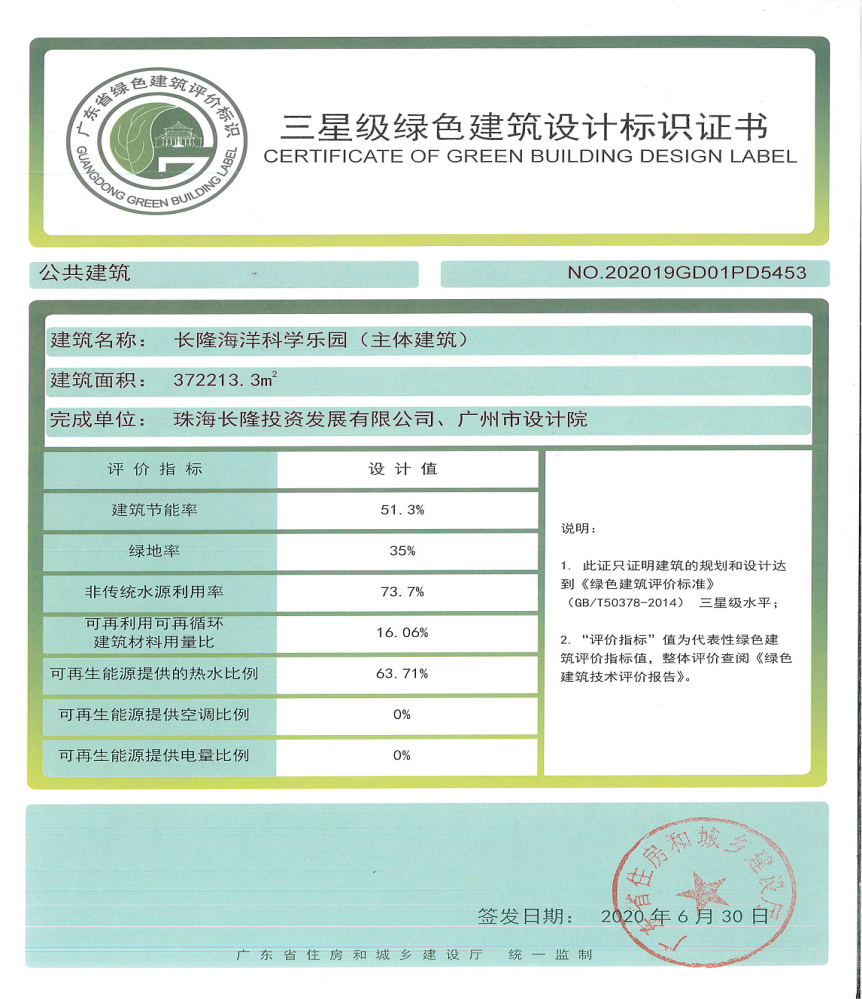 2020年8月,经专家评审,yd2333云顶电子游戏下属广州市设计院主导设计、同时与国内外多家设计单位共同合作的珠海长隆海洋科学馆项目(又名:珠海长隆海洋科学乐园)获得广东省住房和城乡建设厅颁发的三星级绿色建筑设计标识证书和美国绿色建筑委员会颁发的LEED金级预认证证书,成为大型主题乐园建筑中绿色、低碳的典范。