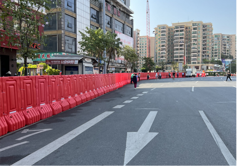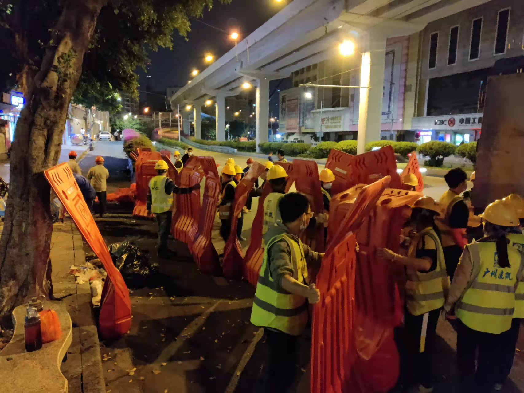四建公司副总经理梁世雄带领10名管理人员和25名工人,在一小时内完成围蔽材料及工具采购运输工作,并克服卸货地点分散、街道狭窄需要人工搬运水马、居民不理解进行阻挠破坏等困难,完成沙涌北街1.5公里施工任务。恒盛公司派出由44名管理人员和306名工人组成的应急先锋队开展施工。面对时间紧急物资调动难度大、施工地区道路狭窄材料运输不便等困难,公司党委书记、董事长杨超宇及时协调部署,副董事长、总经理曾广庆和副总经理曾佳靠前指挥,调动各地可支配水马共计5046个,高效完成对云城路段、广园西路口、景云居、金信路向云城东路等区域共计6.3公里施工任务。