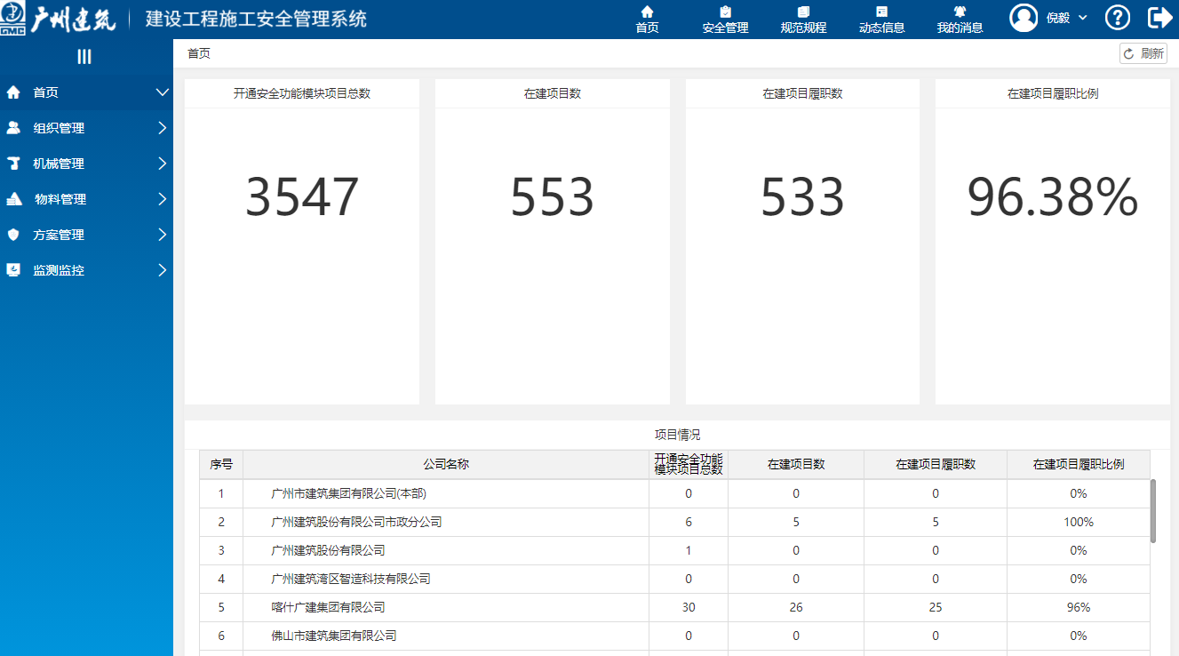 “集团建设工程施工安全管理系统”在项目管理方面以危大工程管理为节点流程,通过智能识别、移动互联网、大数据以及人工智能技术对施工项目进行信息化、数字化、智能化管理。本次检查内容涵盖建设施工安全管理系统的项目使用图库、组织管理、机械管理、物料管理、方案管理、监测监控等6个模块。检查结果显示,yd2333云顶电子游戏属下18家施工企业,在建项目544个工地,软件使用数534个,使用比例达96.38%。其中,已有10家企业系统使用覆盖率达100%。