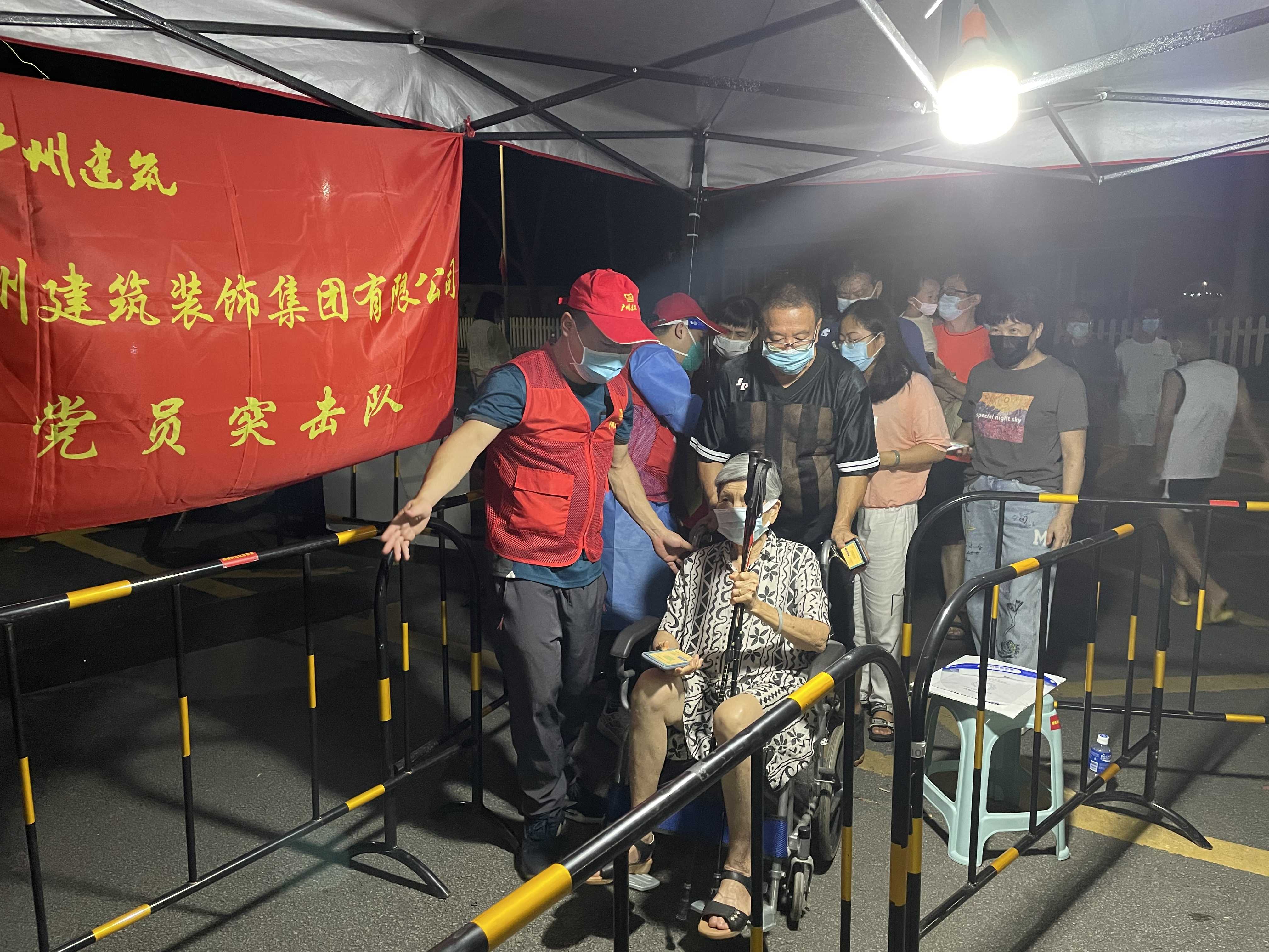 10月5日下午,“广建先锋”志愿服务30名队员紧急奔赴南沙街道沙螺湾村,开展核酸检测上门动员工作。户外烈日炙烤,气温高达30摄氏度以上。队员们顶着骄阳、耐着高温,全程身穿密不透风的防护服,上楼下楼四处奔忙,累计完成沙螺湾村及悦然府小区排查动员共302栋2075户。当扫楼排查任务紧张开展近6小时后,队员们又接到南沙区委的紧急要求,需立刻前往南沙社区开展支援。队员们简单对付了几口晚饭,便马不停蹄转战下一个支援地点。他们努力克服着身体上的疲惫和不适,一直奋战到次日凌晨1点,完成全部扫楼排查任务,并协助医护人员完成核酸检测,以实际行动诠释着广建人的战斗意志和奉献精神。